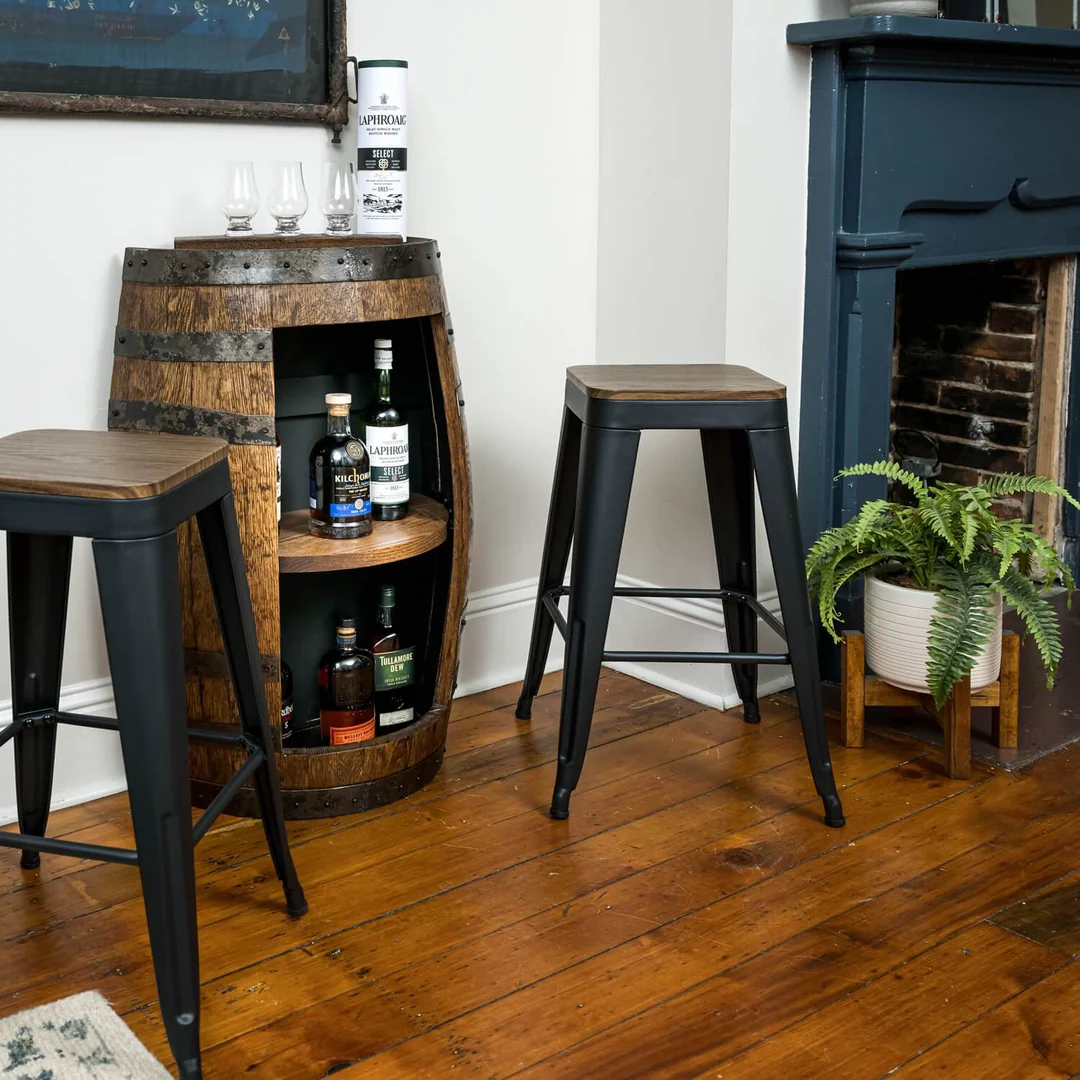 Enjoy authentic wood, handcrafted character, functional storage, and rustic charm — all in a space-saving package that fits seamlessly into your home or bar.
